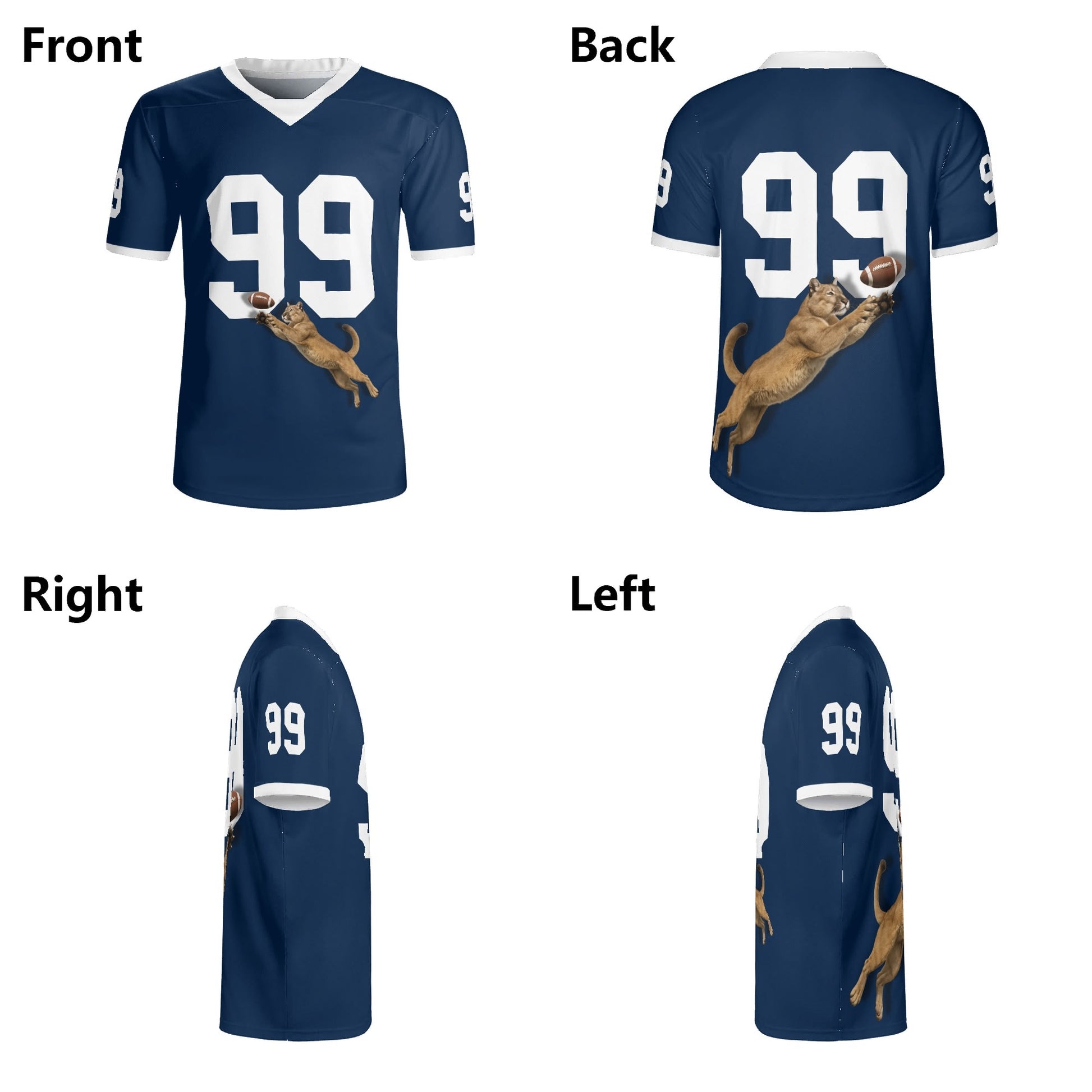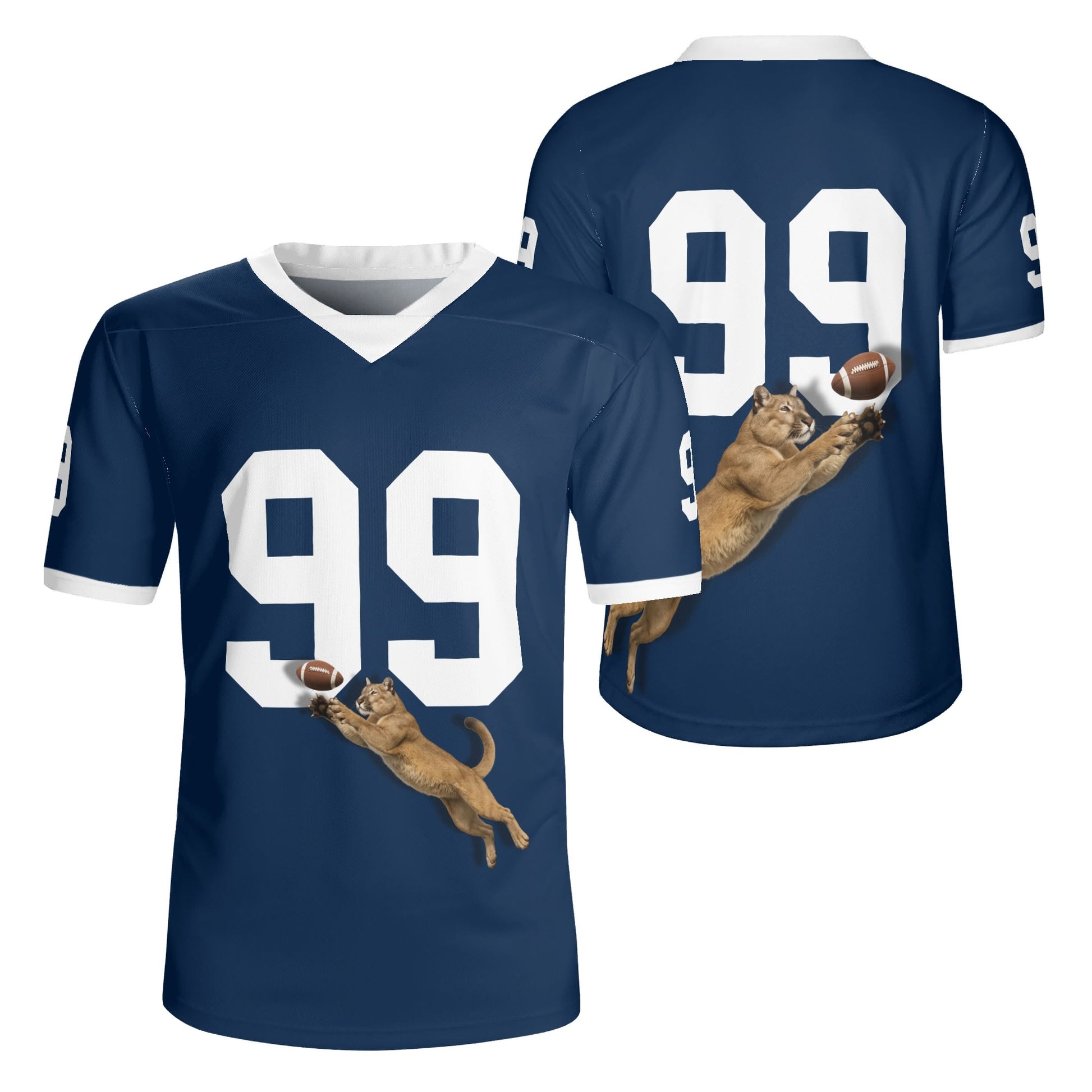 Navy football jersey with mountain lion graphic. Personalize your number. Breathable mesh, unisex S–7XL. Made to order—add to cart today.
