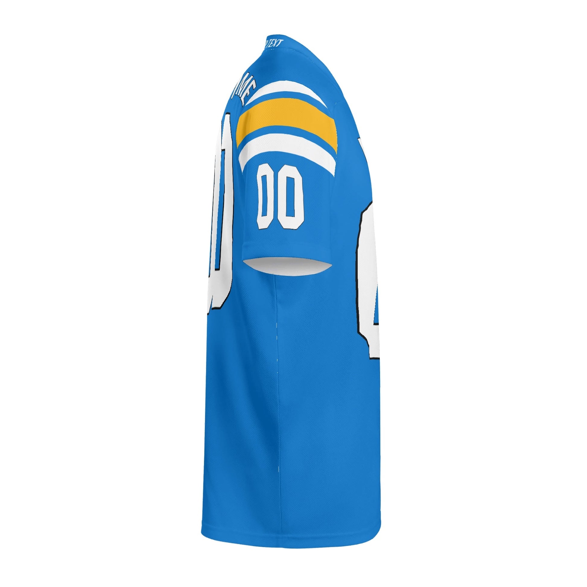Electric blue/yellow football jersey with lightning stripe. Add your name and number. Breathable mesh, unisex S–7XL. Made to order—add to cart today.