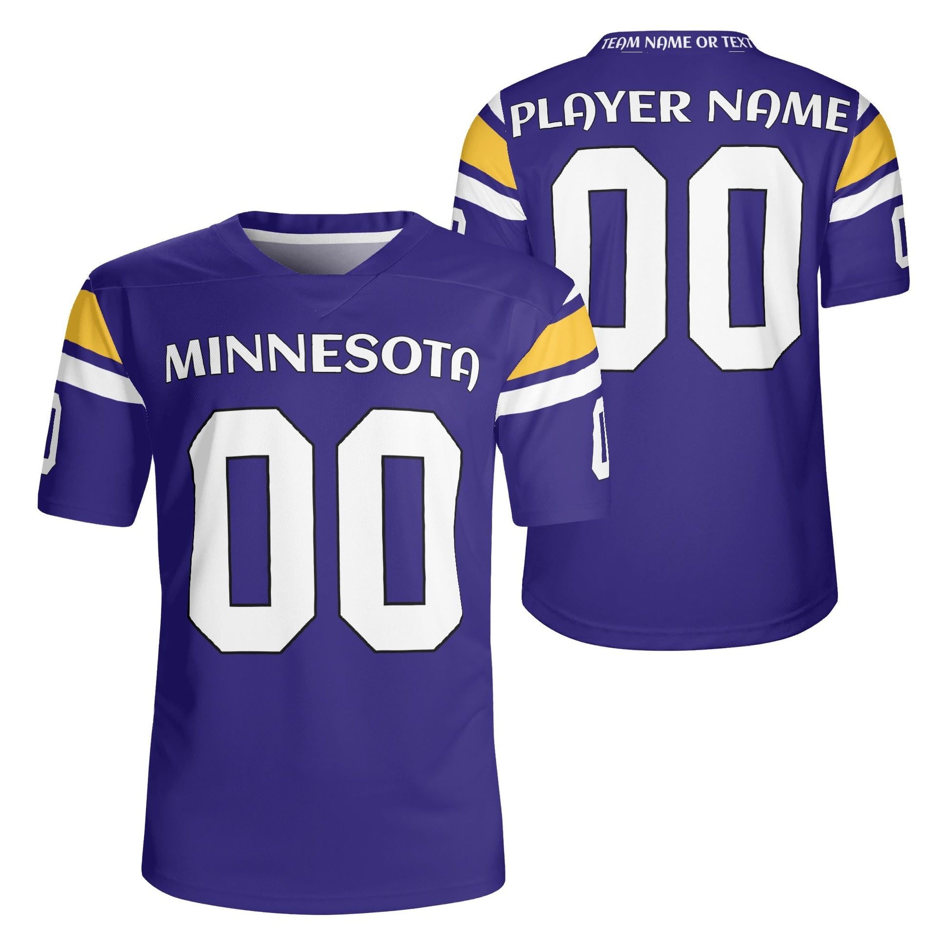 Purple/gold team-color football jersey in breathable mesh. Add your name and number. Unisex S-7XL. Made to order—add to cart today.