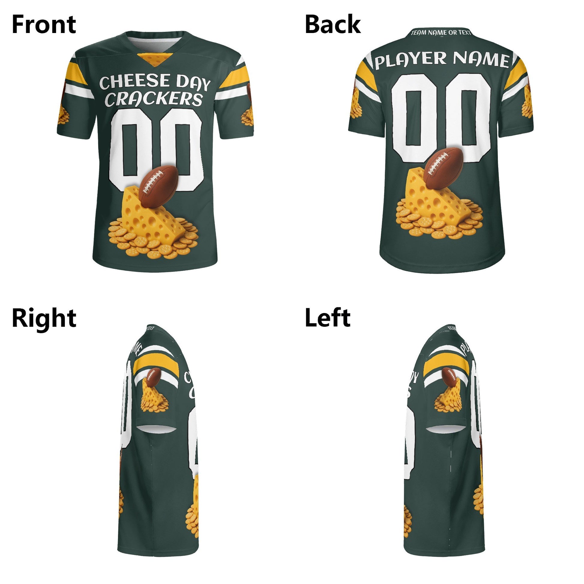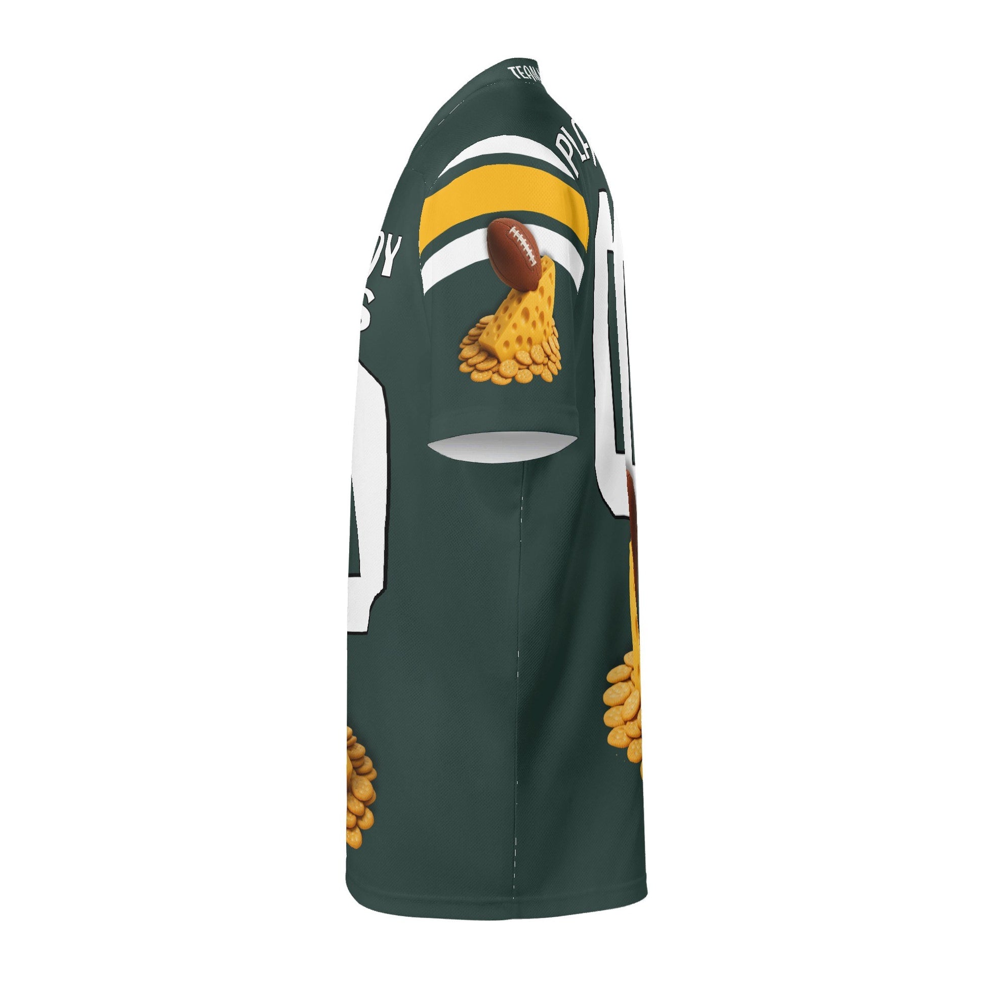 Green/gold football jersey with cheese & cracker graphic. Personalize name & number. Breathable mesh, unisex Sβ7XL. Made to orderβadd to cart today.