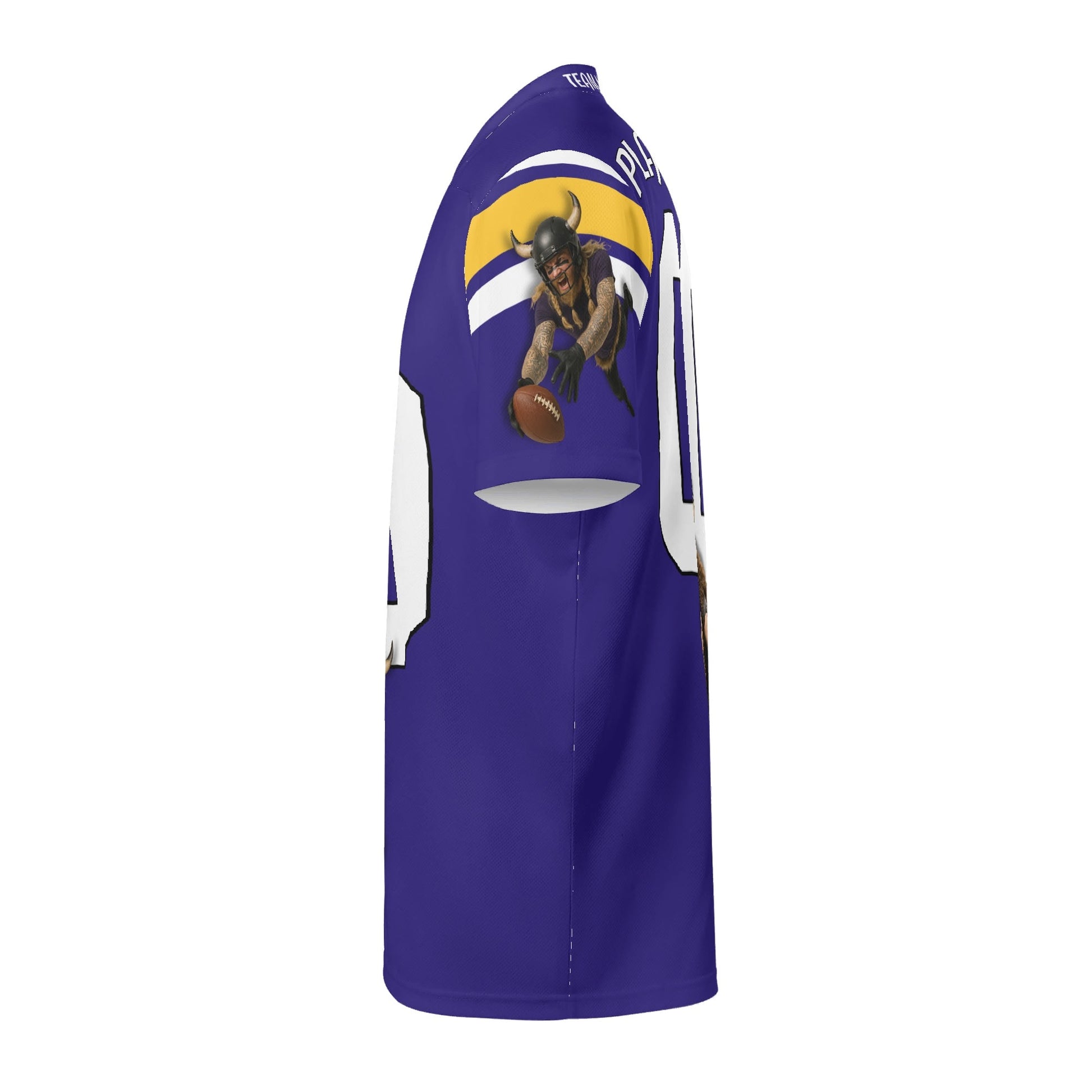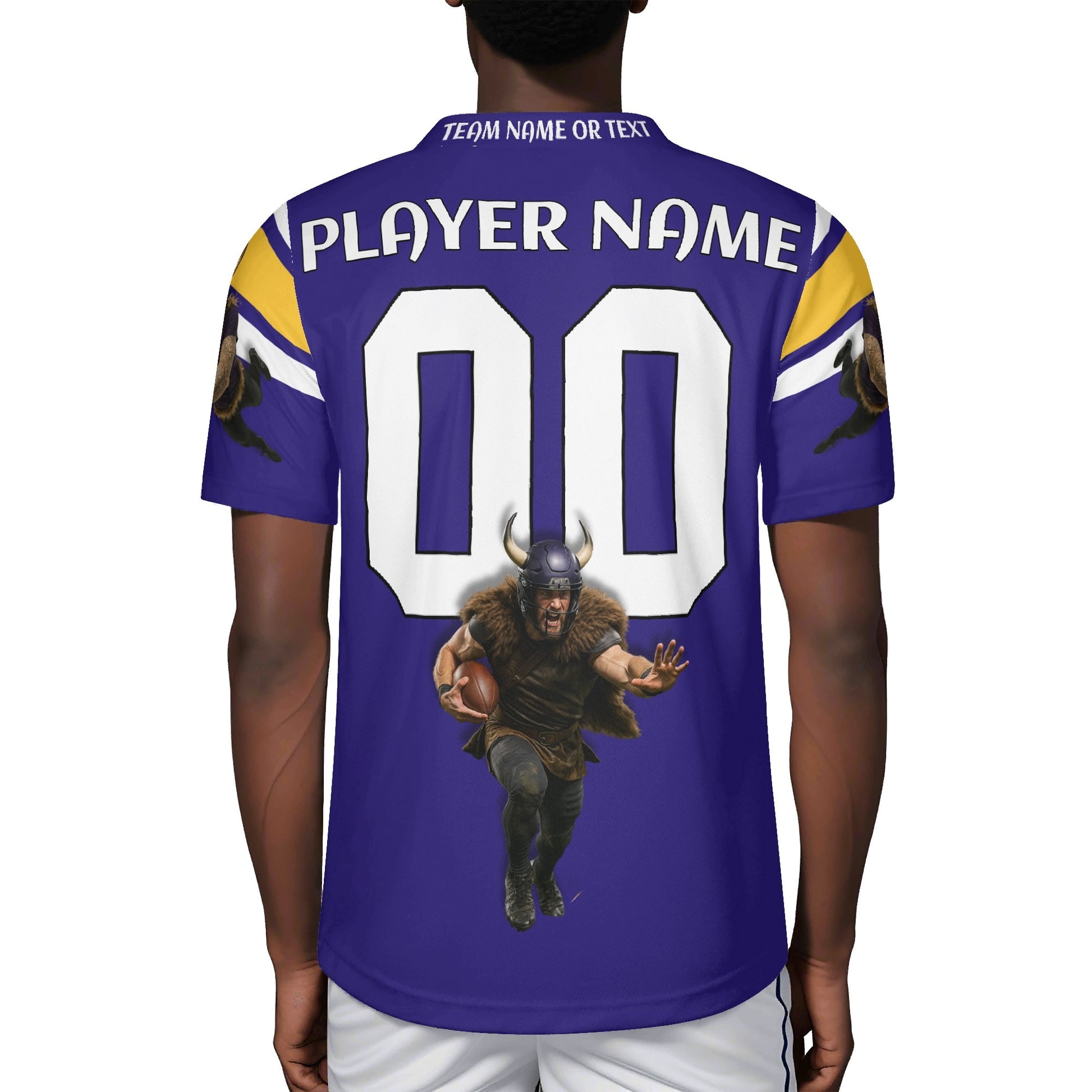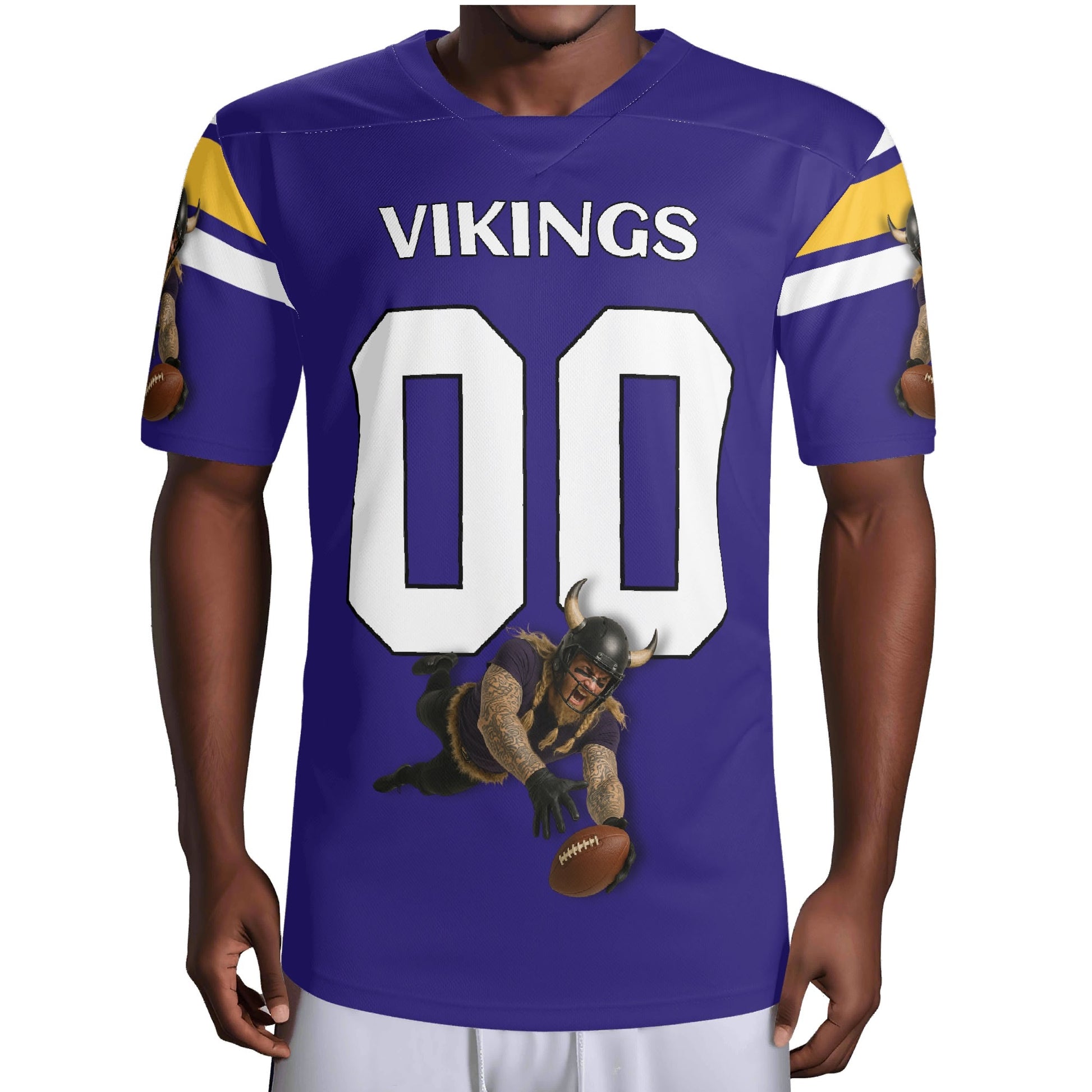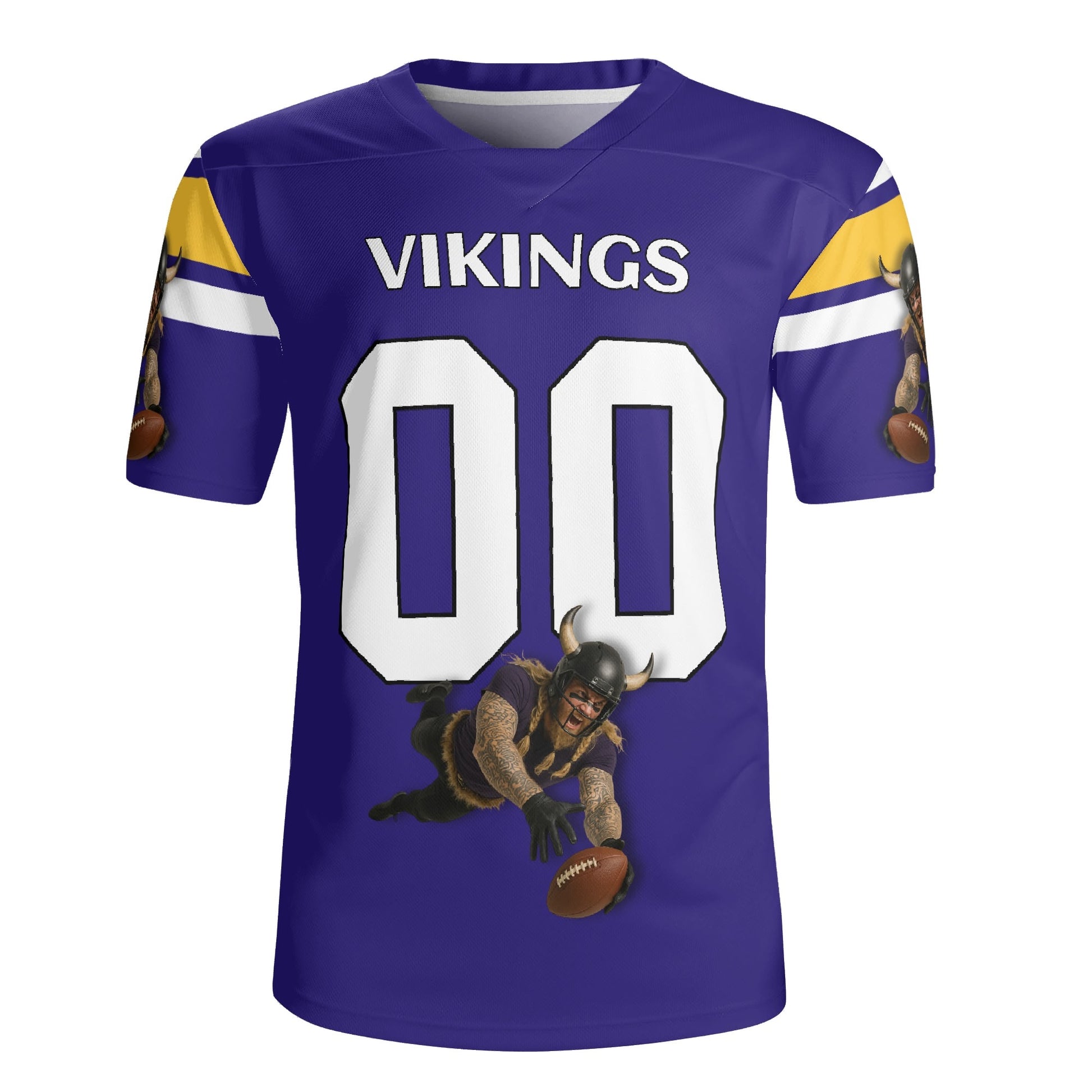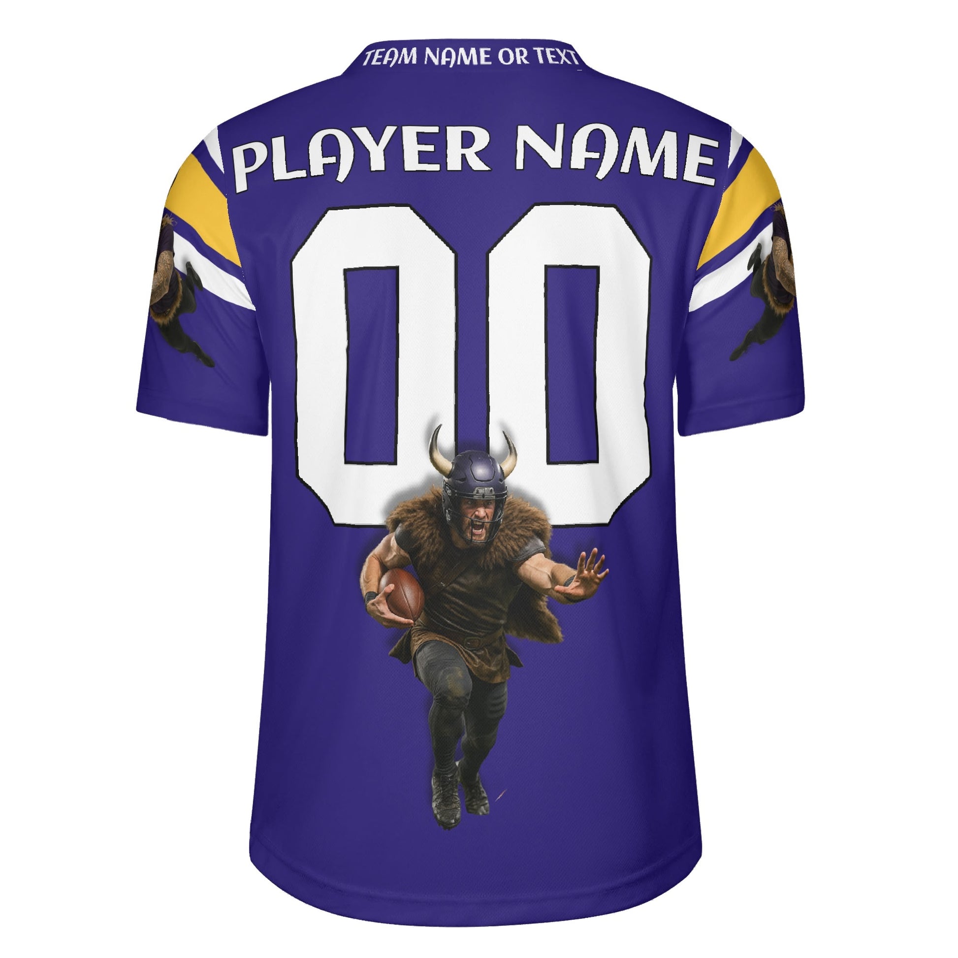Purple/gold football jersey with Viking warrior graphic and sleeve stripes. Personalize name & number. Breathable mesh, unisex S–7XL. Made to order—add to cart today.
