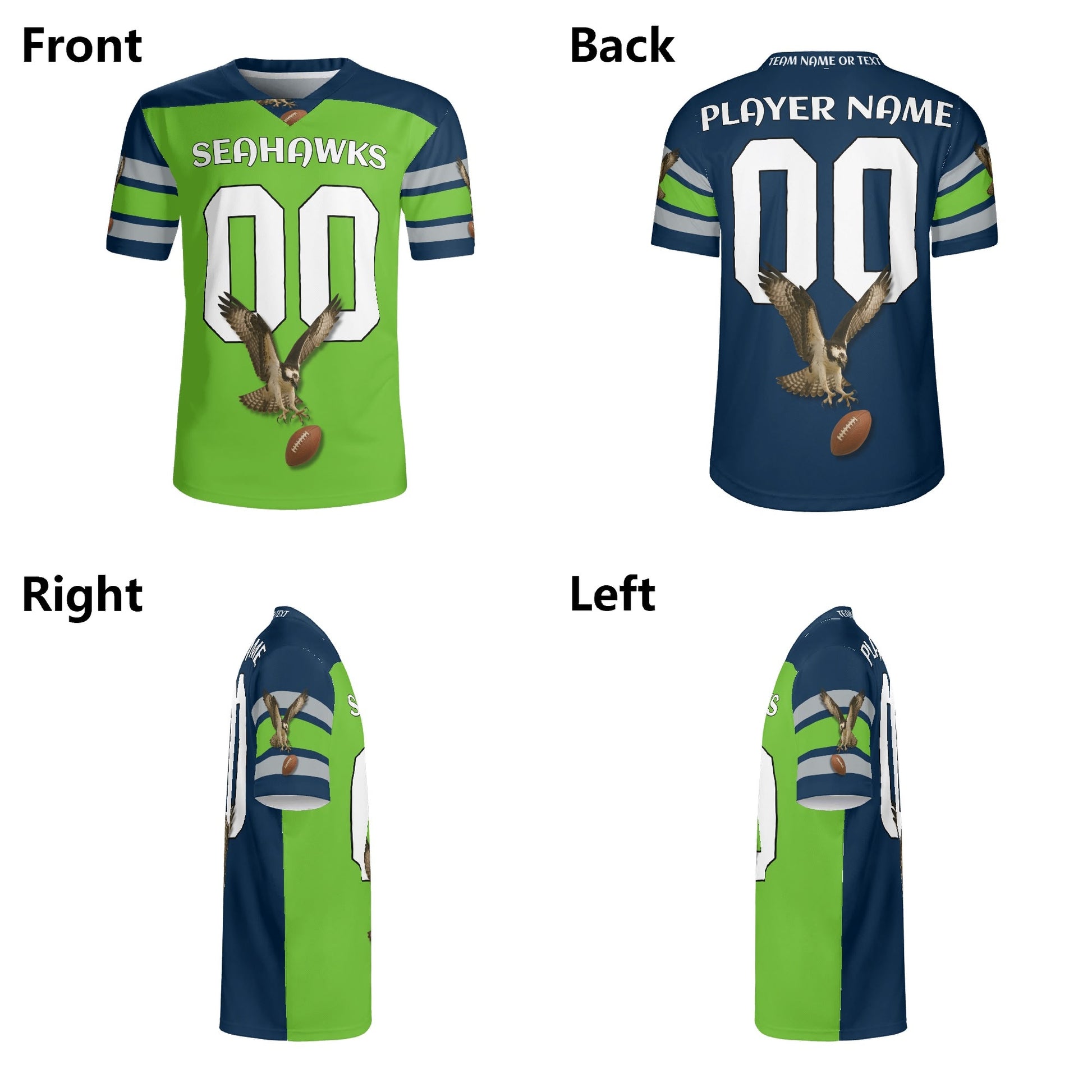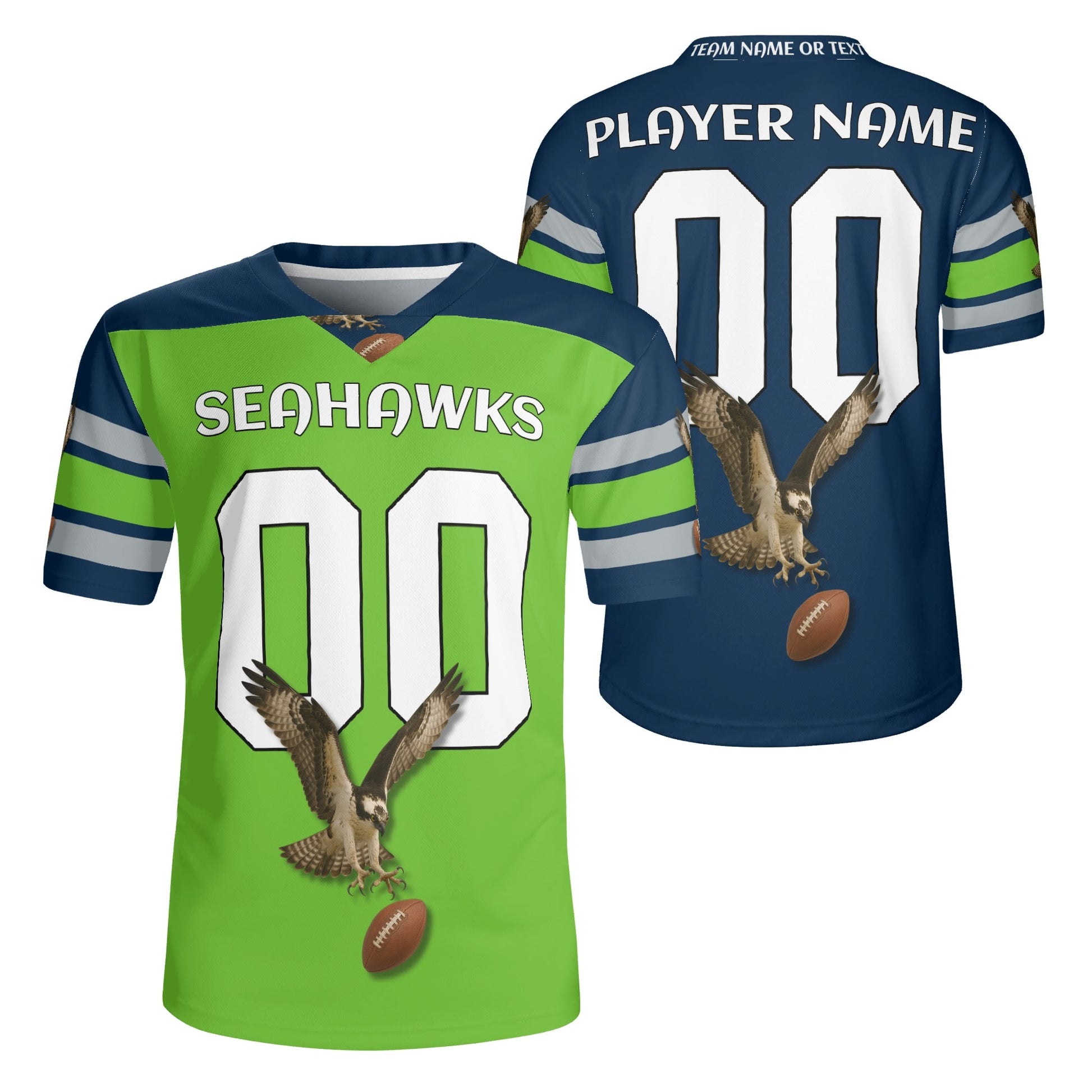 Neon-green/navy football jersey with hawk graphic and sleeve stripes. Personalize name & number. Breathable mesh, unisex S–7XL. Made to order—add to cart today.