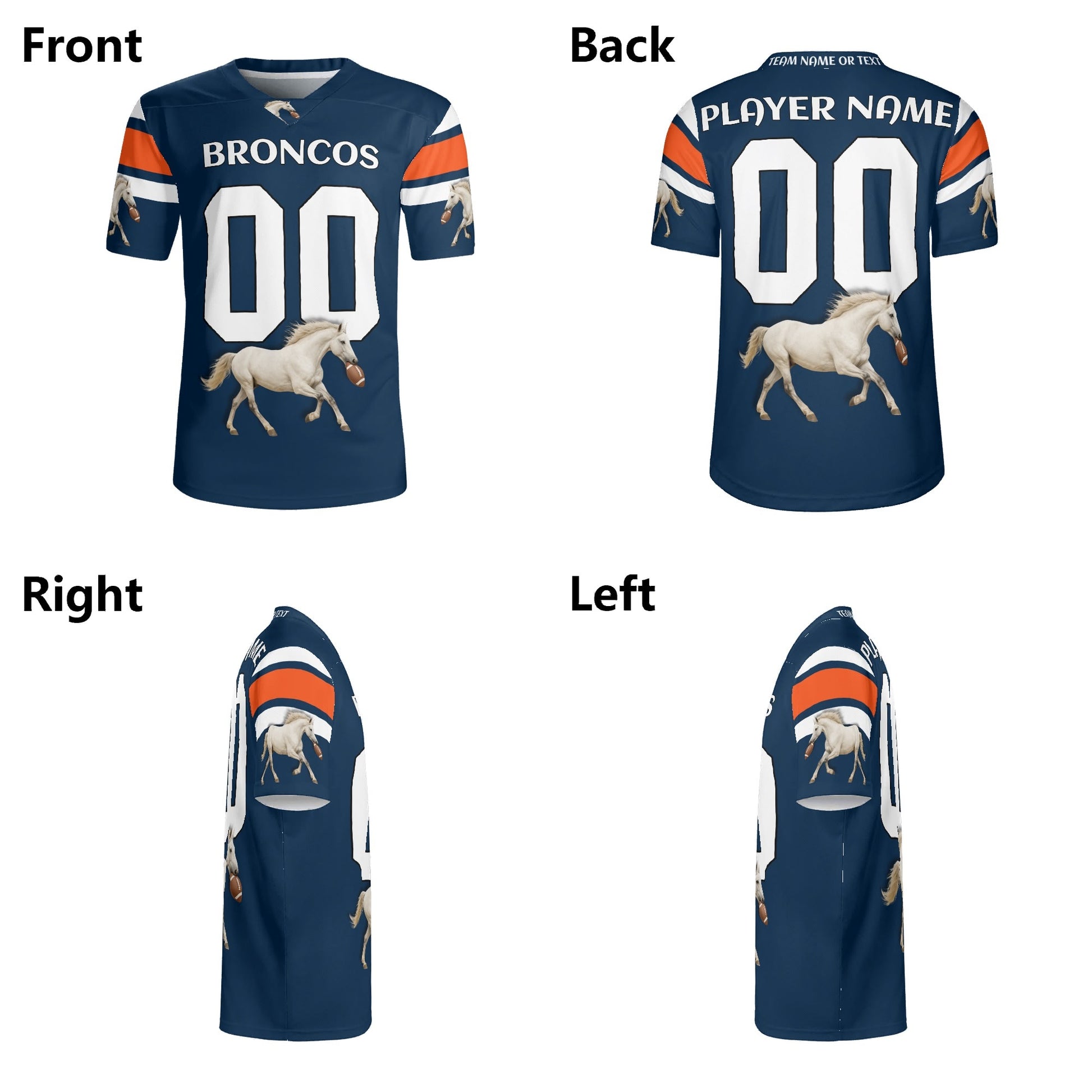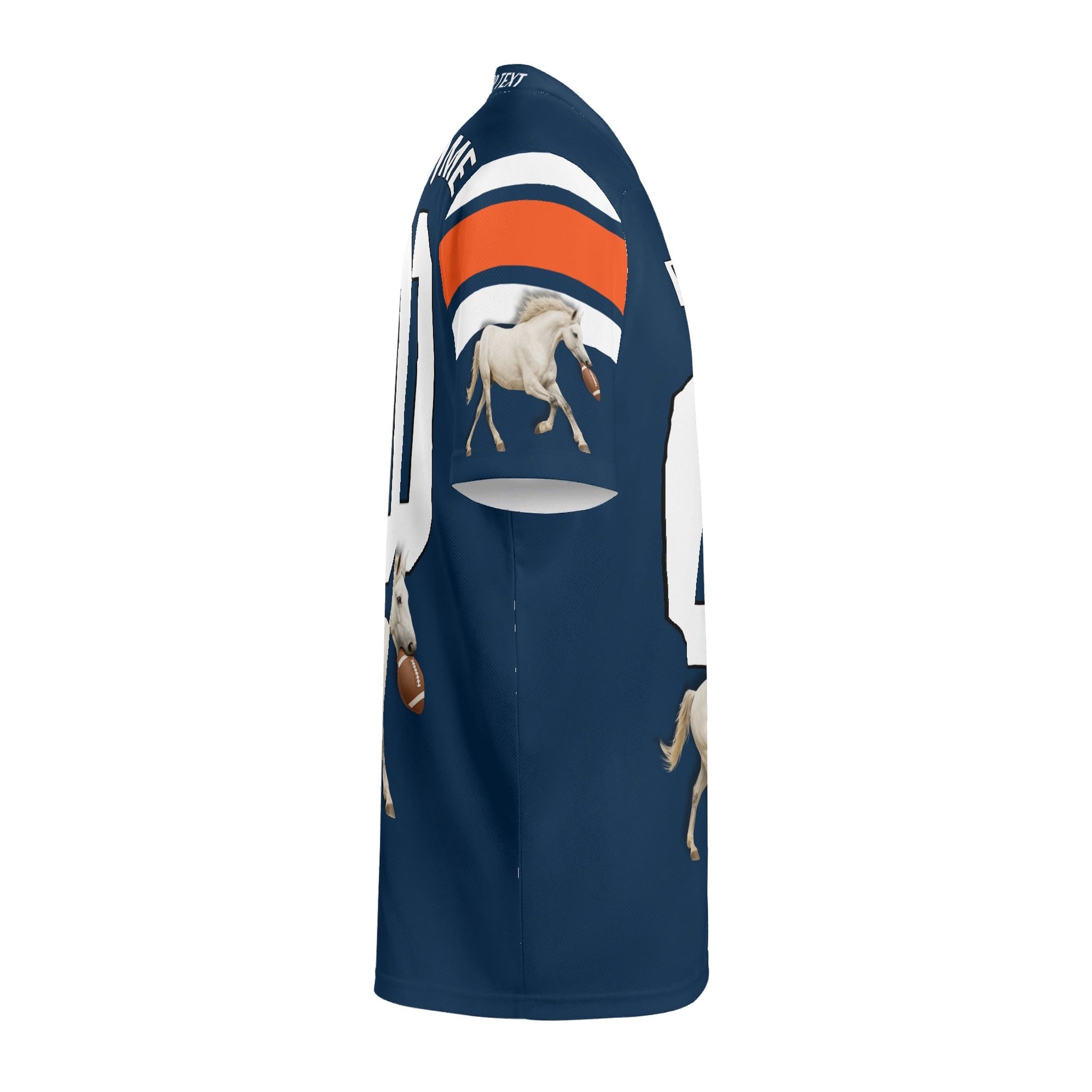 Navy/orange football jersey with bronco horse graphic. Personalize your name & number. Breathable mesh, unisex S–7XL. Made to order—add to cart today.