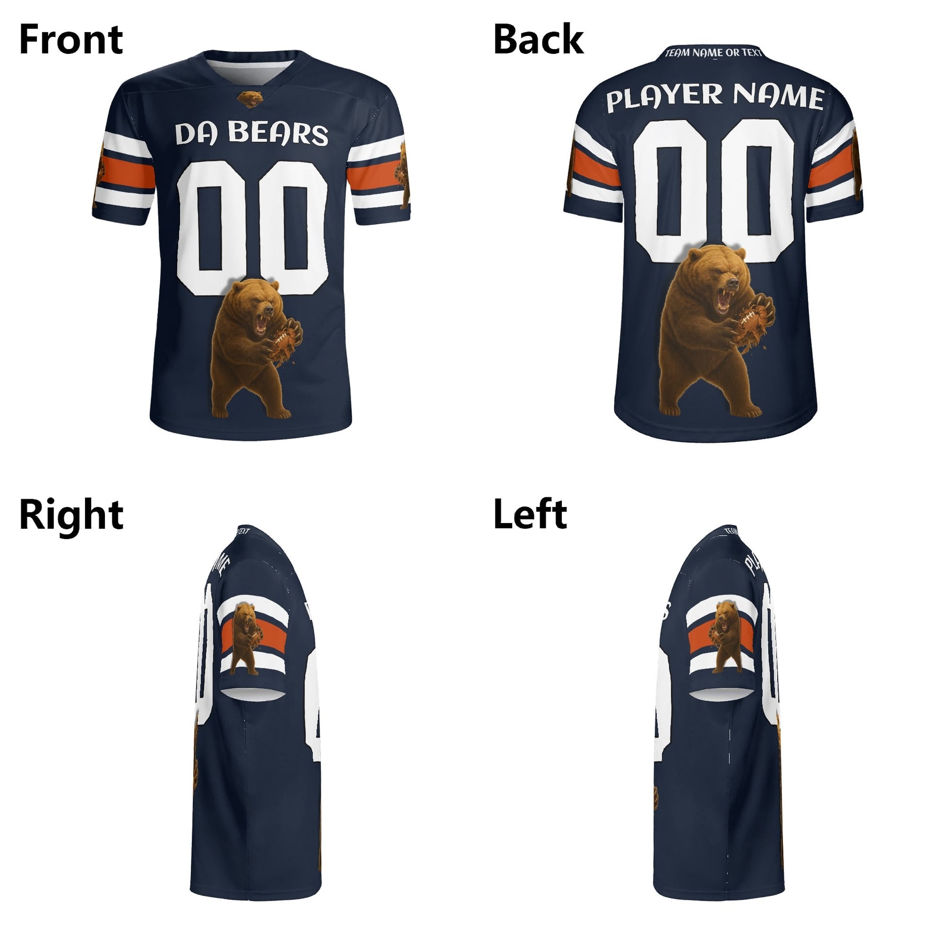 Navy/orange football jersey with bear graphic and sleeve stripes. Personalize name & number. Breathable mesh, unisex S–7XL. Made to order—add to cart today.