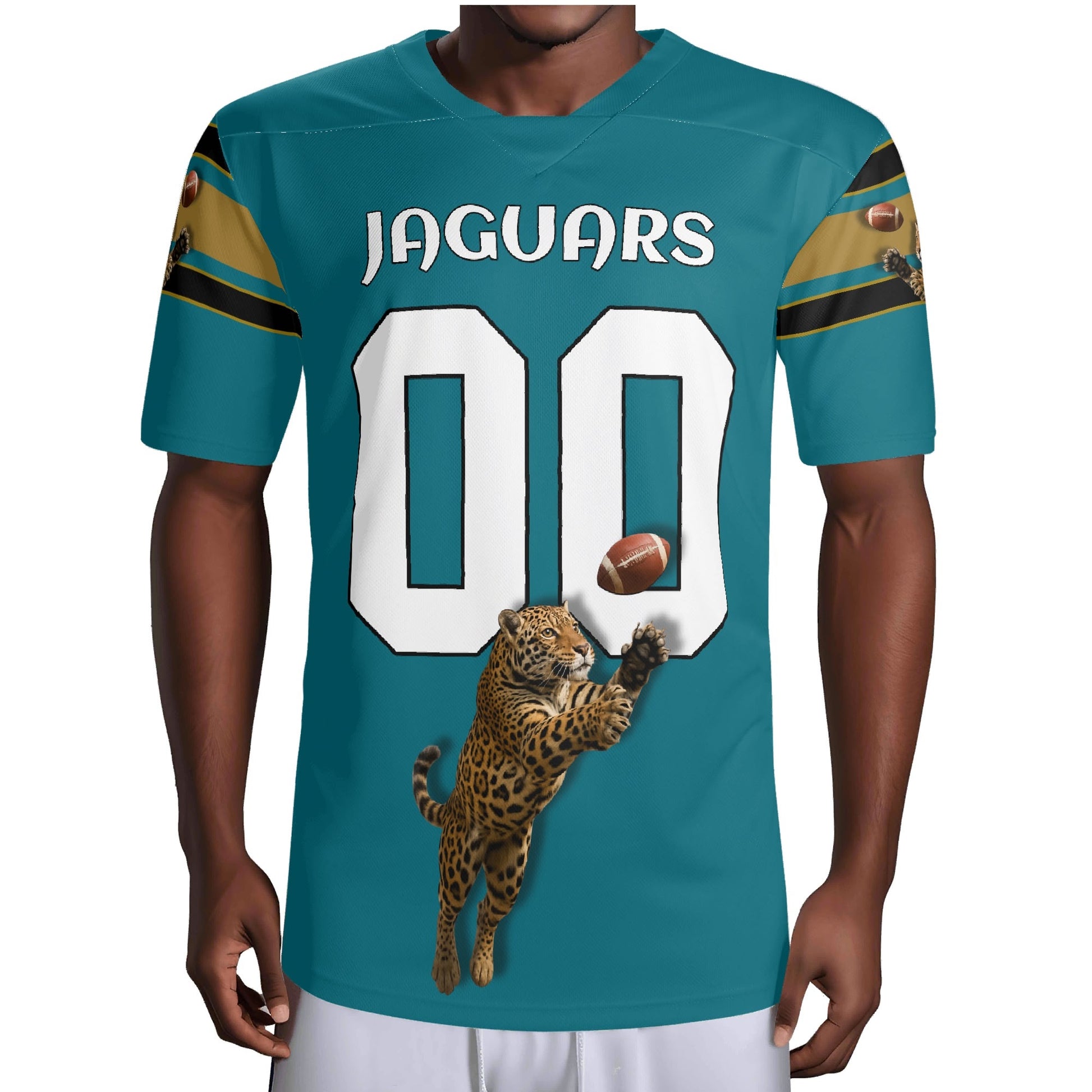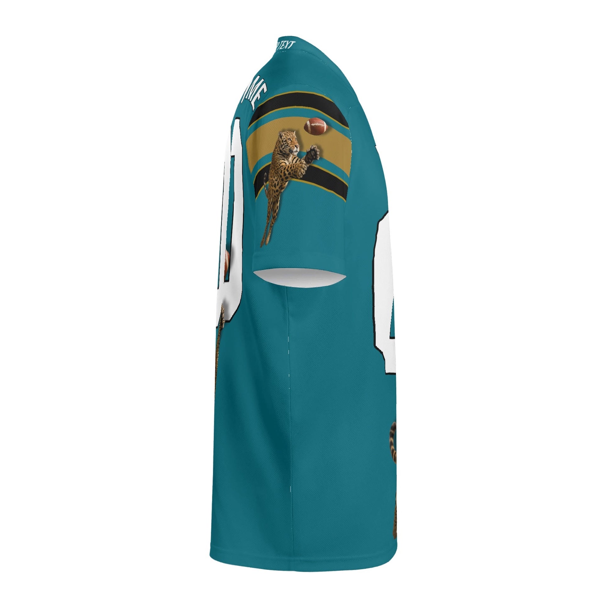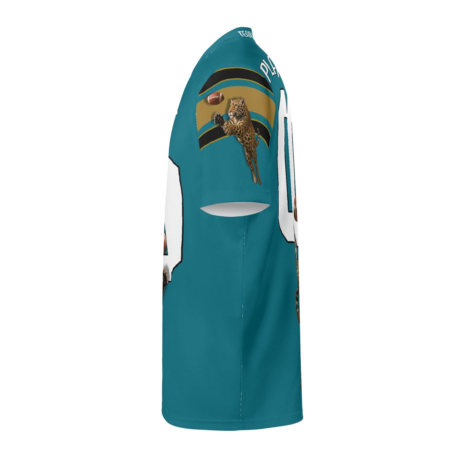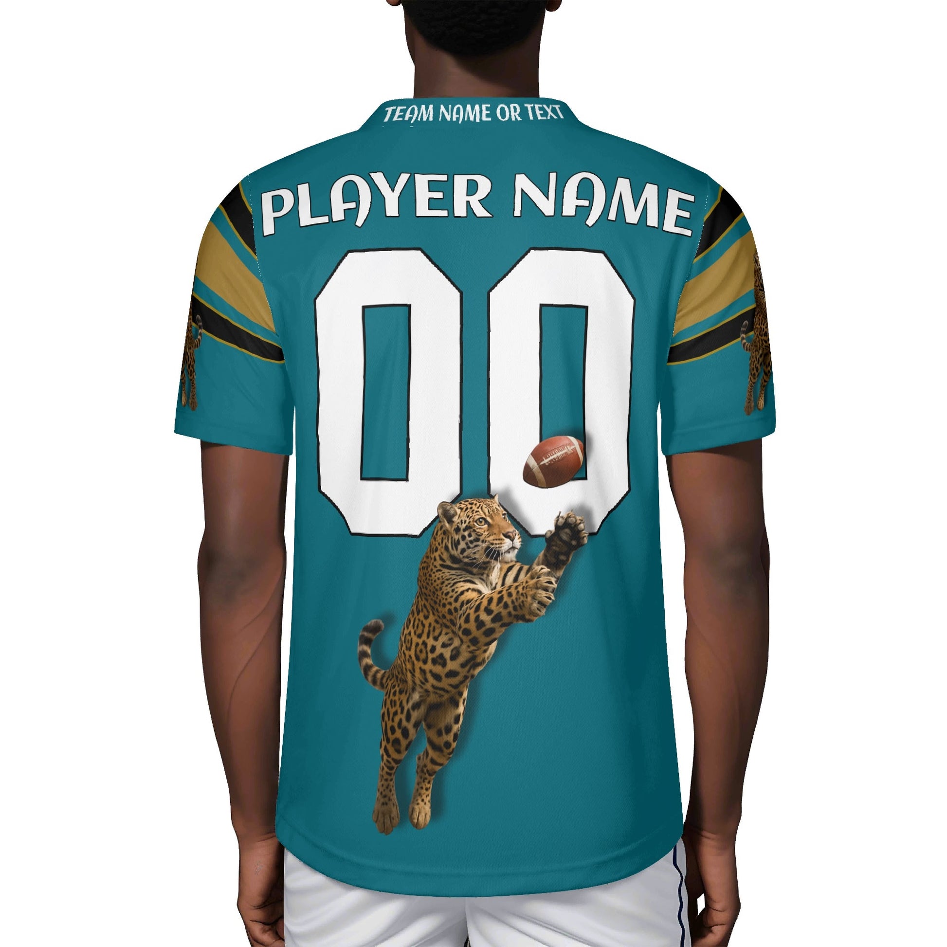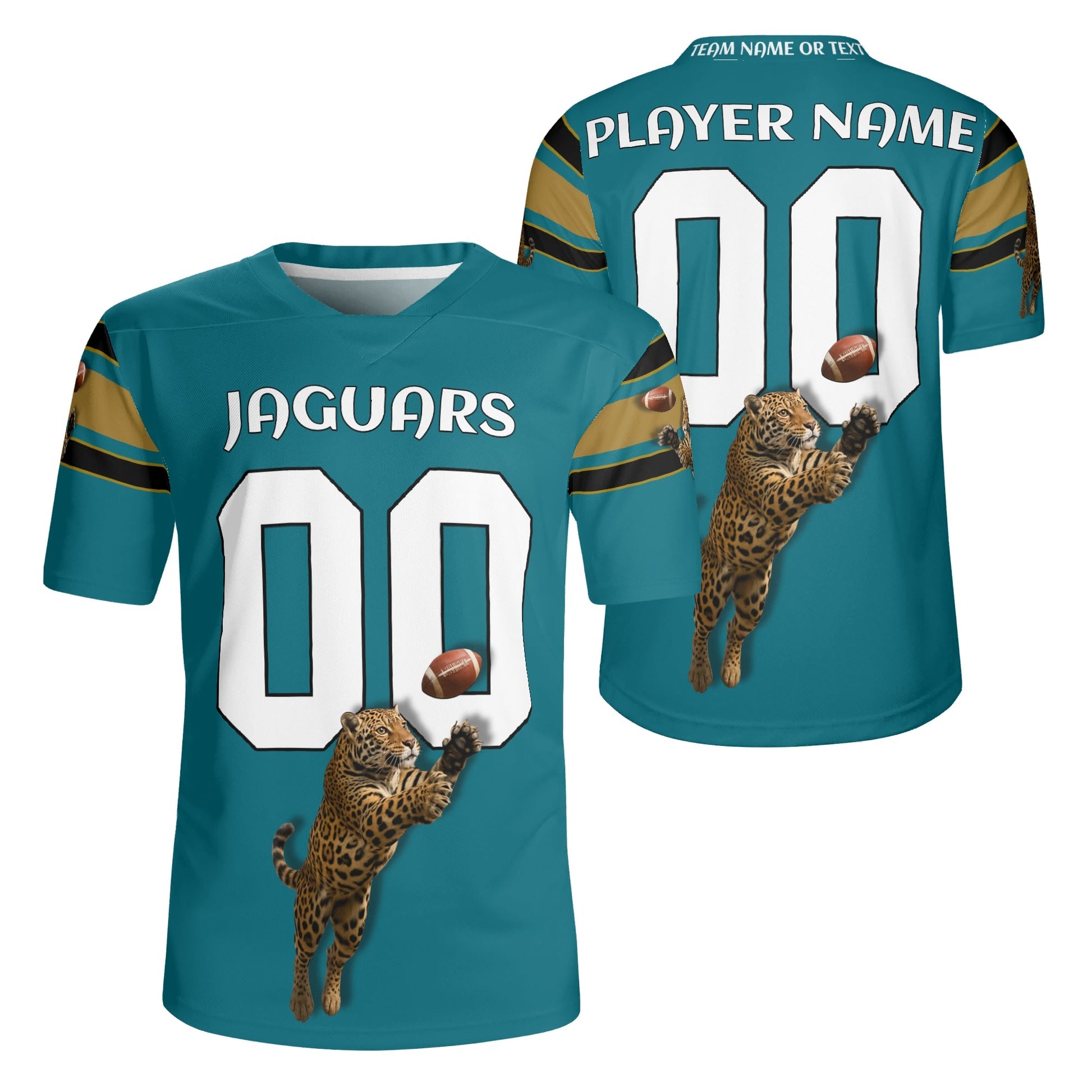• Teal/black with gold accents, sleeve striping, and a bold jaguar graphic for a pro, on-field look.